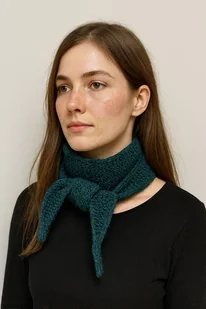 Mały szalik - apaszka wykonany w całości ręcznie na drutach z dwóch nitek wysokiej jakości miękkiej norweskiej włóczki 100% superfine alpaca, w kolorze petrol oraz leśnym zielonym. Alpaka jest włóknem n ...