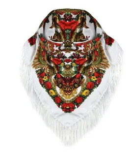 Przepiękna chusta w stylu folk Wyjątkowe ludowe wzornictwo Barwne, kwiatowe wzory Wykończona lamówką z długimi frędzlami znakomita jakość Chusta to przepiękn...