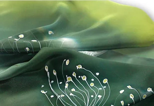 Delikatny, ręcznie malowany szal z kwiatowym wzorem w wiosennych zieleniach. Naturalny jedwab, doskonały zarówno na jesienne i zimowe chłody, jak i letnie upały. Wymiary pracy to 38x180cm.W szalu domi ...