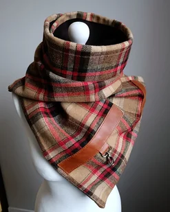 Bardzo starannie wykonany szal zapinany na 2 karabińczyki. Szal zostały uszyty z 2 warstw materiału - wierzchnia - kraciasta tkanina wełniana w kolorach, beżowym, brązowym i czerwonym, spód z brązow ...
