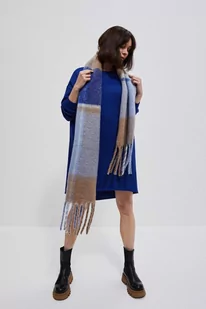 100%POLIESTER. Szal zdobiony niebiesko-beżowo-grafitową kratkę. Zakończony frędzlami. Bardzo ciepły i miły w dotyk.