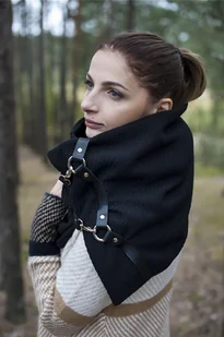 Szal wełniany ze skórą, Unisex - Rockowy Czarny