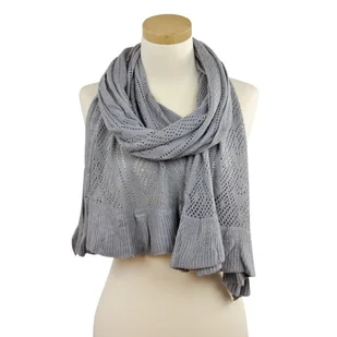 Długi szal w delikatny ażurowy wzór, zakończony falbaną.Wykonany z przyjemnego, syntetycznego materiału.Sprawdzi się jako klasyczny szal lub lekka narzutka na chłodniejsze dni.Będzie również idealnym dodatkiem do wszelkich eleganc