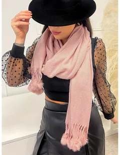 Szeroki szal zimowy z pomponami - pudrowy róż Zachwyć się luksusem i stylem tego wyjątkowego szalika! Wykonany z delikatnego, miękkiego materiału z domieszką wełny, to kwintesencja kobiecości i elegancji. Jego wyrafinowany odcień to idealny dodatek do zimowej garderoby, a puszyste pompony na końcach dodają mu uroku i oryginalności. Nie tylko otuli Cię ciepłem w chłodne dni, ale także doda klasy każdej stylizacji. Idealny na prezent lub jako wyjątkowy dodatek dla siebie. Nie przegap szansy, aby wyróżnić się tym przepięknym szalikiem w kolorze pudrowego różu!