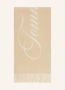 Długie frędzle na końcach. Napis marki. Czysta wełna