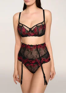 Pas do pończoch "Poppy" z kolekcji Hot Poupee Marilyn to elegancki, szeroki pas, wykonany z delikatnego czarnego tiulu, zdobionego subtelnym haftem w motyw maków. Gorsetowe cięcia zostały dodatkowo podkreślone satynowymi taśmami, które dodają wyrafinowanego charakteru, nawiązując do detali obecnych w biustonoszu z tej samej kolekcji. Pas wyposażony jest w wygodne zapięcie na taśmę z haftkami, co umożliwia regulację obwodu dla idealnego dopasowania. Regulowane i elastyczne paski zakończone są dyskretnymi żabkami, co gwarantuje stabilność i komfort noszenia. To doskonały wybór dla kobiet ceniący