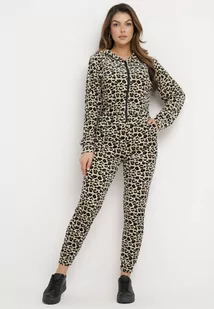 Beżowy Komplet Dresowy w Panterkę z Welurowej Dzianiny Alermi