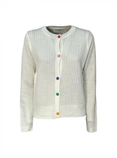 Giacca bianca in maglia. Con scollo rotondo e maniche lunghe. Chiusura frontale con bottoni colorati.