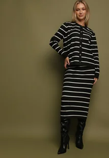 Czarny Komplet z Wiskozą Bluzka z Guzikami i Spódnica w Paski Asirrise