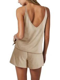 REORIA Typ: damski dres dwuczęściowy Materiał: wysokiej jakości bawełna Kolor: beżowy Krój: bezrękawnik z dekoltem i tyłem w serek + spodnie Rozmiar: