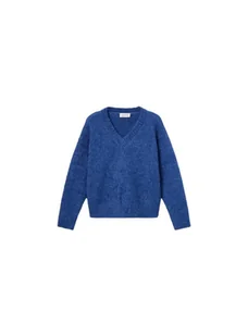 Maglione blu in maglia testurizzata con scollo a V e maniche lunghe con spalle leggermente scese. COMPOSIZIONE: 87% acrilico riciclato 10% lana 3% acrilico