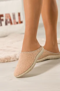 Beżowe kapcie damskie Inblu obuwie domowe z materiału typu baranek z ozdobną lamówką wkładka soft VG969299