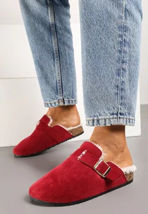Bordowo-Czerwone Płaskie Kapcie z Futerkiem Paskiem i Klamrą Lorninnia