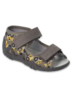 Chłopięce kapcie z nadrukiem dinozaurów autek – szare z odkrytymi palcami. Wygodne kapcie dla chłopców w szarym kolorze, ozdobione nadrukiem dinozaurów autek...