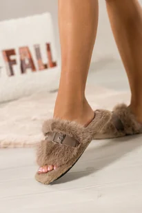 Ciemnobeżowe kapcie damskie obuwie domowe futrzane beżowy pasek ze srebrną klamerką Casu NG-40