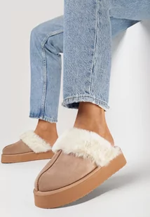Ciemnobeżowe Kapcie z Ekozamszu na Grubej Podeszwie z Ozdobnym Przeszyciem i Futerkiem Iindriala