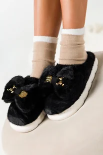 Czarne kapcie damskie obuwie domowe futrzane z kokardą złoty miś Casu M570-36/37