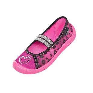 Obuwie dla dziewczynki w intensywnych kolorach różu z połyskującymi cekinami. Ozdobne gumki podtrzymujące stopę. Oddychające spody. Klasyczny kształt spodu.