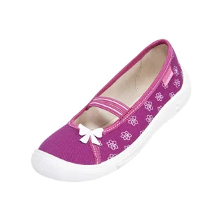 Klasyczne obuwie dla dziewczynki. Cholewka w kolorze fuksji w biały kwiatowy nadruk. Mała delikatna kokardka. Oddychające spody. Klasyczny kształt spodu.