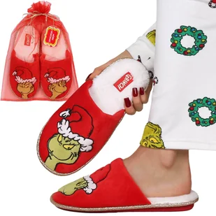 Grinch ANTYPOŚLIZGOWE damskie papcie domowe, CIEPŁE, MIĘKKIE, ŚWIĄTECZNE kapcie do domu + woreczek ozdobny NA PREZENT 40-41 EU Te czerwone kapcie z wizerunkiem Grincha to idealny dodatek na świąteczny sezon – wygodne, ciepłe i z nutą humoru. Wykonane z miękkiego, pluszowego materiału z puszystym wnętrzem gwarantują przyjemne ciepło i komfort noszenia nawet w najzimniejsze dni. Przód ozdobiony jest haftem przedstawiającym klasyczną, zadziorną minę Grincha w czapce Mikołaja, co nadaje im wyjątkowego charakteru. Antypoślizgowa podeszwa zapewnia stabilność, a lekkie wykonanie sprawia, że są idealne do codziennego użytku w domu. Kapcie pakowane są w ozdobny woreczek prezentowy, dzięki czemu świetnie sprawdzą się jako świąteczny upominek.