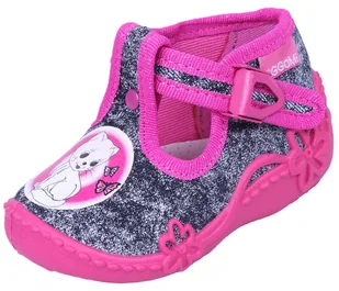 Szaro-różowe buciki dla dziewczynki z nadrukowanym wizerunkiem kotka. Buty posiadają metalowe zapinki, dzięki którym można dostosować ich szerokość do dzieci...