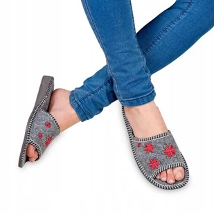 Filcowe klapki damskie w kwiatki Szare Klapki filcowe damskie - parametry: Wysokość obcasa: 21 mm Wysokość pod palcami: 5 mm Wzór: ażurowy, czerwone kwiatki ...