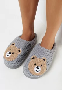 Szare Kapcie z Miękkiego Futerka Ozdobione Misiem Geraja