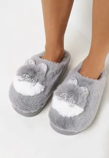 Szare Wsuwane Kapcie na Płaskiej Podeszwie z Aplikacją 3D w Kształcie Króliczka z Cyrkoniami Pottira
