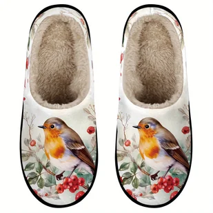 TEMU Damskie Przytulne Kapcie Wsuwane z Nadrukiem Ptaków i Gili – Miękka Flanelowa Cholewka i Antypoślizgowa Gumowa Podeszwa, Całoroczne do Domu i na