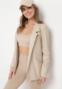 Beżowa Marynarka o Pudełkowym Fasonie z Ekoskóry z Poduszkami w Ramionach Sunins