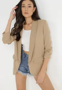 Beżowa Marynarka Bez Zapięć z Ozdobnym Marszczeniem i Imitacją Kieszeni Phelotis