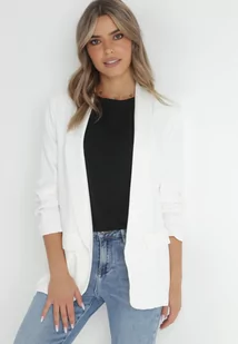 Biała Marynarka Bez Zapięć z Ozdobnym Marszczeniem i Imitacją Kieszeni Phelotis