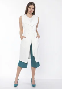 Kamizelka damska z paskiem, z boku kieszenie, Wykonana z nierozciągliwego materiału. Długość kamizelki do wysokości kolan. Modelka ma 178 cm wzrostu i nosi rozmiar 36 Prać ręcznie w 30 ° C, suszyć w pozycji p ...
