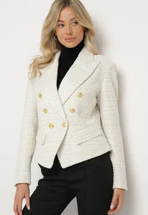 Jasnobeżowa Dwurzędowa Marynarka Taliowana w Tweedowym Stylu z Imitacją Kieszeni Liolia