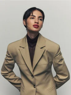 Marynarka o dopasowanym kroju, uszyta z gładkiej tkaniny z dodatkiem wiskozy.