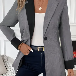 TEMU Stylowa Damska Marynarka w Jednolitym Kolorze z Kołnierzykiem i Guzikami - Elegancka Kurtka z Długim Rękawem, Pranie Maszynowe, Dwukolorowy Wzór