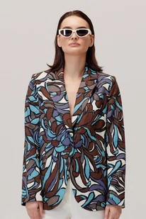 Najważniejsze cechy: Uszyty w Polsce z dbałością o precyzyjne odszycie i dopracowany detal; Materiał to naturalna, przewiewna tkanina o płóciennym splocie i szlachetnej strukturze; Fason: klasyczny żakiet jednorzędowy z wcięciem w talii i prostą linią ramion; Kolor: grafika w odcieniach morskiej głębi – kompozycja chłodnych błękitów, indygo i ciepłego brązu na kremowym tle; Detale: klasyczne klapy, zapięcie na jeden guzik, kieszenie z patkami, wyrazisty print o florystycznej energii; Opis produktu: