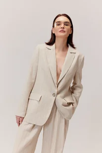 Najważniejsze cechy Zaprojektowany i uszyty w Polsce z dbałością o detale i konstrukcję, Tkanina o matowym wykończeniu, Podszewka: acetat – lekka, oddychająca i przyjemna dla skóry, Kolor: jasny, naturalny beż w drobny prążek – elegancki, ponadczasowy i letni, Detale: klasyczne klapy, kieszenie z patką, pionowe cięcia modelujące, lekka konstrukcja ramion, zapięcie na pojedynczy guzik. Opis produktu Żakiet Portofino to nowoczesna interpretacja klasycznej elegancji – idealny na sezon wiosna–lato, Tkanina z przewagą wiskozy i lnu została wzbogacona o nitkę metaliczną, która dodaje całości subtelnego, niemal biżuteryjnego efektu, Naturalny odcień beżu z delikatnym prążkiem i jasna, lekko połyskująca podszewka tworzą ponadczasowy duet w duchu effortless chic.