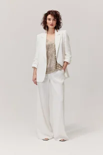 wysokiej jakości lyocell – miękki, przewiewny i przyjemny w dotyku; idealny do eleganckich stylizacji ze spodniami Bono i szpilkami; doskonały do casualowych zestawów – świetnie komponuje się z t-shirtem, jeansami i sneakersami; Zestaw dostępny również w głębokiej czerni, pudrowym różu i eleganckim szarym kolorze. Szyte w Polsce. Skład: Tkanina: 100% lyocell ; Podszewka: 100% actetat Wymiary produktu dla rozmiaru 34: Długość całkowita - 77 cm Długość rękawa - 53 cm Obwód biustu - 96 cm Obwód pasa - 96 cm Obwód w biodrach - 102 cm Każdy kolejny rozmiar zwiększa się o 4 cm w obwodach (nie dotyczy długości całkowitej).