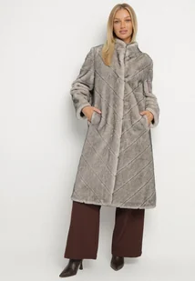 Beżowy Długi Płaszcz Futerko z Ozdobnymi Przeszyciami i Stójką Zenima