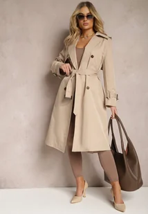 Beżowy Trencz Płaszcz z Plisami na Tyle Paskiem w Talii i Dwurzędowym Zapięciem Sigin