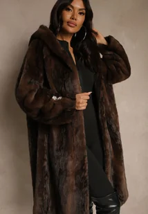 Brązowy Elegancki Płaszcz Futerko z Kapturem i Ozdobnymi Guzikami Esilea