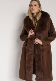 Brązowy Płaszcz Ozdobiony Odpinanym Futerkiem Lianossa
