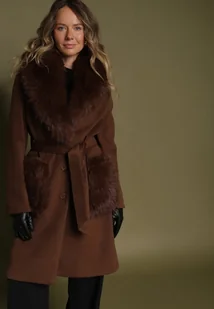 Brązowy Płaszcz Wiązany w Talii z Futrzanym Kołnierzem i Kieszeniami Perrie