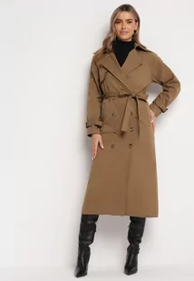 Brązowy Długi Płaszcz Trencz Dwurzędowy z Paskiem w Talii Cadenite