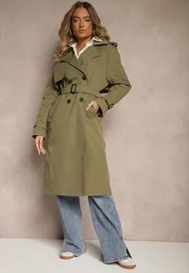 Ciemnozielony Klasyczny Płaszcz Trencz z Wiskozą o Dwurzędowym Kroju z Paskiem Mokaia