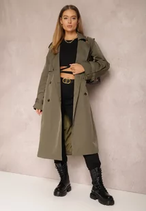 Ciemnozielony Płaszcz Trencz Dwurzędowy z Paskiem Lene