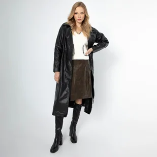 Kluczowe cechy: Luksusowy materiał: Wykonany z najwyższej jakości owczej skóry, która charakteryzuje się wyjątkową miękkością i odpornością na uszkodzenia. Praktyczne detale: Dwie głębokie kieszenie pomieszczą wszystkie niezbędne drobiazgi, a pasek pozwoli idealnie dopasować płaszcz do sylwetki, podkreślając talię.