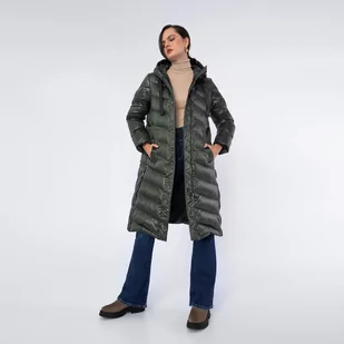 Damski płaszcz puchowy. W tym płaszczu stylowo i wygodnie przechodzisz zimowe miesiące. Wykonany został z połyskującego, geometrycznie pikowanego nylonu. Dopełniają go matowe poliestrowe wstawki z tyłu na plecach i kapturze. Długi i oversizowy fason wypełniony jest w 70% kaczym puchem i 30% kaczym pierzem, więc zapewni Ci ciepło w naprawdę mroźne dni.