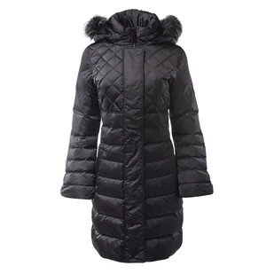 Materiał główny: 100% poliester Podszewka: 100% poliester Wypełnienie: 80% kaczy puch, 20% kacze pierze Długi puffer z tkaniny syntetycznej Regularny krój Wysoki kołnierz z kapturem Zapięcie na suwak Pikowana tkanina Materiał wodoodporny i wiatroszczelny Pasek w talii Kaptur ze sztucznym futrem Wypełnienie z naturalnego puchu pozyskiwane w sposób odpowiedzialny